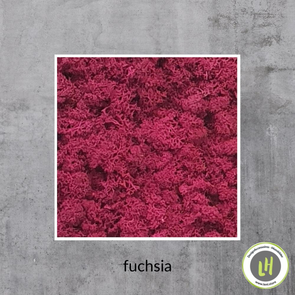 Moosbild eckig Islandmoos in der Farbe fuchsia – Dieses Motiv in der Größe 300 x 300 Millimeter gibt es in 13 verschiedenen Farbtönen: Fuchsia, Naturgrün, Limonengrün, Orange, Creme, Gelb, Schwarz, Mediumgrün, Hellgrün, Rot, Blau, Braun, Waldgrün. Das breite Farbspektrum an Moosbildern ermöglicht jedem Naturfreund ein Moosbild in seiner oder ihrer Lieblingsfarbe. Mit diesen eckigen Moosbildern lassen sich gezielt Farbakzente setzen oder verschiedenfarbige Moosbildern zu einer Komposition zusammensetzen. Leni.Store-Moosbilder bitte nur im Innenbereich verwenden.