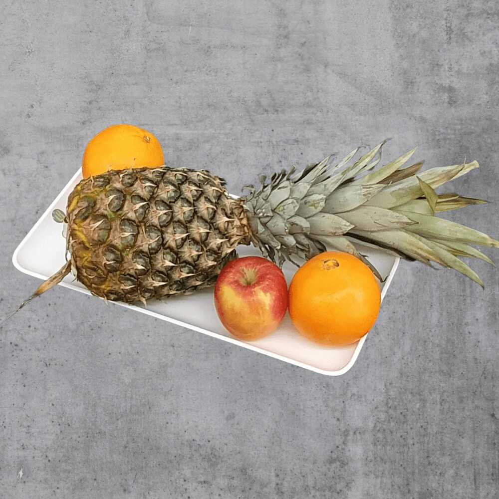 Corian®-Tablett Größe S – Das kleine Vitamin-Paket ist idealerweise immer verfügbar – Birnen, Aprikosen, Pflaumen oder Bananen. Das praktische Tablett aus dem innovativen Mineralwerkstoff Corian® steht am besten immer gut gefüllt in der Küche oder griffbereit neben dem Arbeitsplatz. Auf weißem Grund präsentiert sich Gesundes aus der Natur einfach nur lecker. Da möchte jeder doch gleich zugreifen.